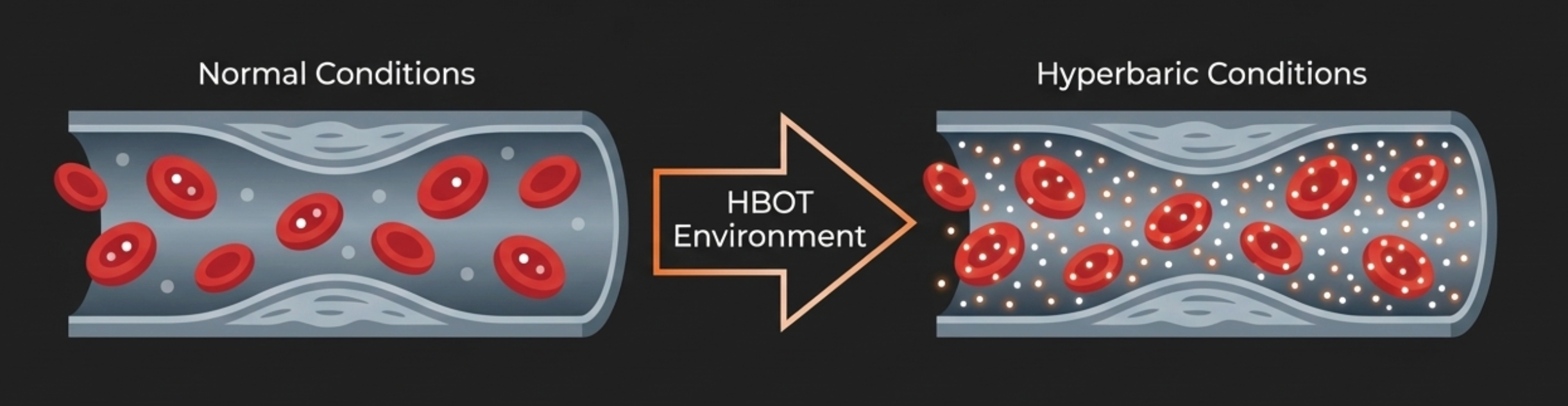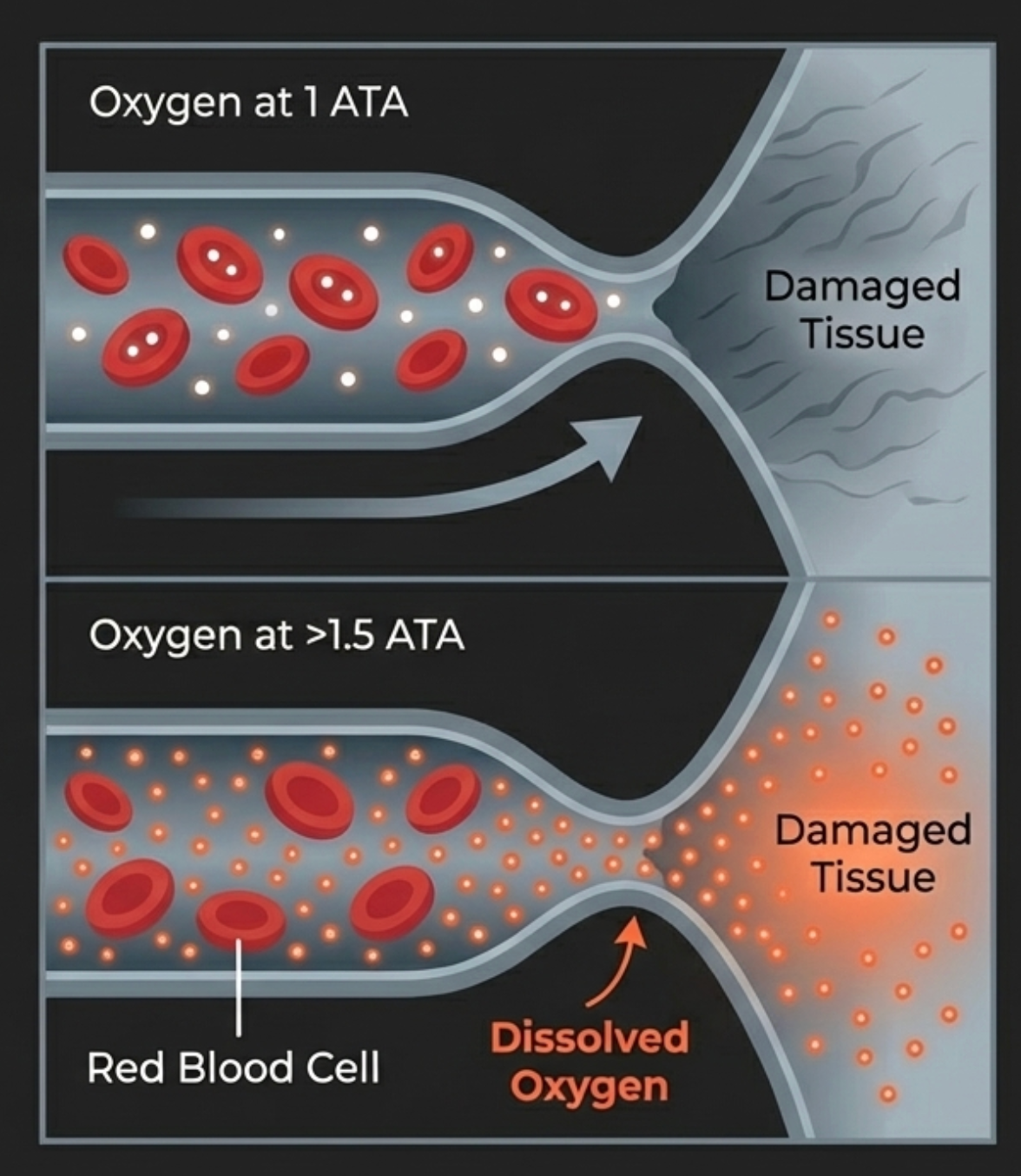 Under increased pressure, oxygen dissolves into your body’s fluids - not just red blood cells - allowing it to penetrate deeper into damaged or inflamed tissues.